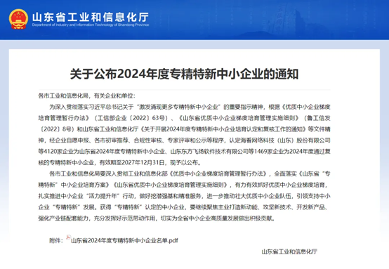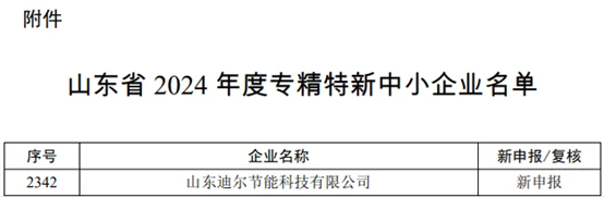 近日,山東省工業(yè)和信息化廳公布2024年度專精特新中小企業(yè),山東迪爾節(jié)能科技有限公司順利通過評審認定。