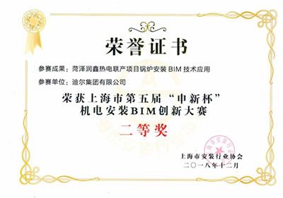 2018年12月,上海市第五屆“申新杯”BIM機(jī)電安裝BIM創(chuàng)新大賽結(jié)果出爐,迪爾集團(tuán)有限公司參賽作品《菏澤潤鑫熱電聯(lián)產(chǎn)項(xiàng)目鍋爐安裝BIM技術(shù)應(yīng)用》斬獲BIM創(chuàng)新大賽二等獎(jiǎng)。